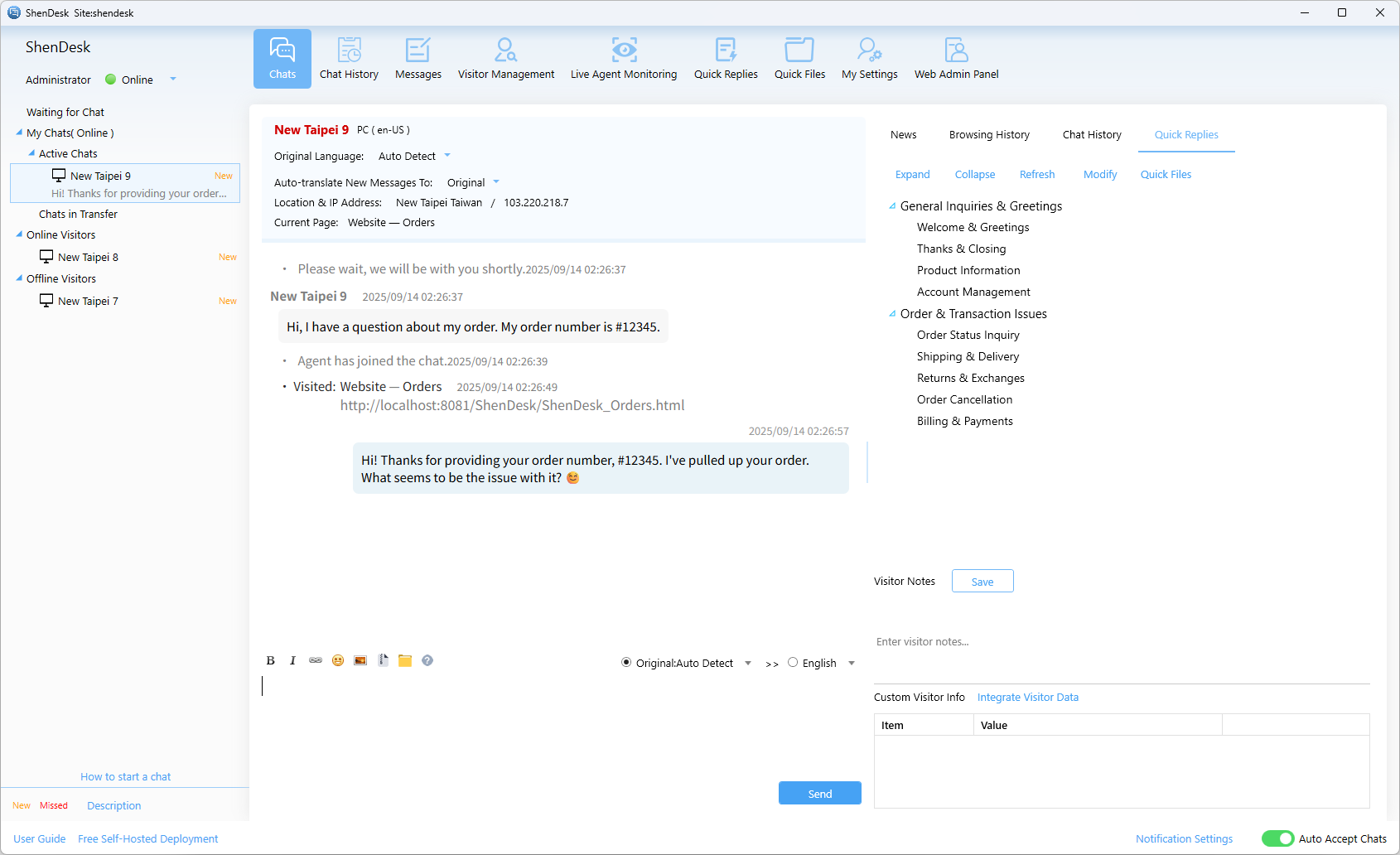 Allow your system to receive message push notifications from ShenDesk and call ShenDesk APIs to send chat messages to visitors and more—enabling a complete business workflow loop.