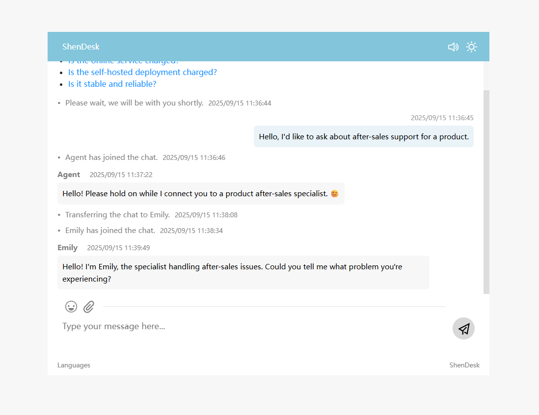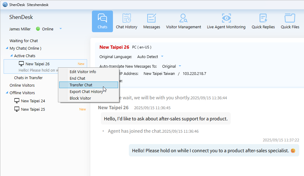 ShenDesk allows ongoing chats to be transferred to another online Agent, who can continue the conversation with the Visitor. The chat is not interrupted, and the new Agent can view the full chat history.